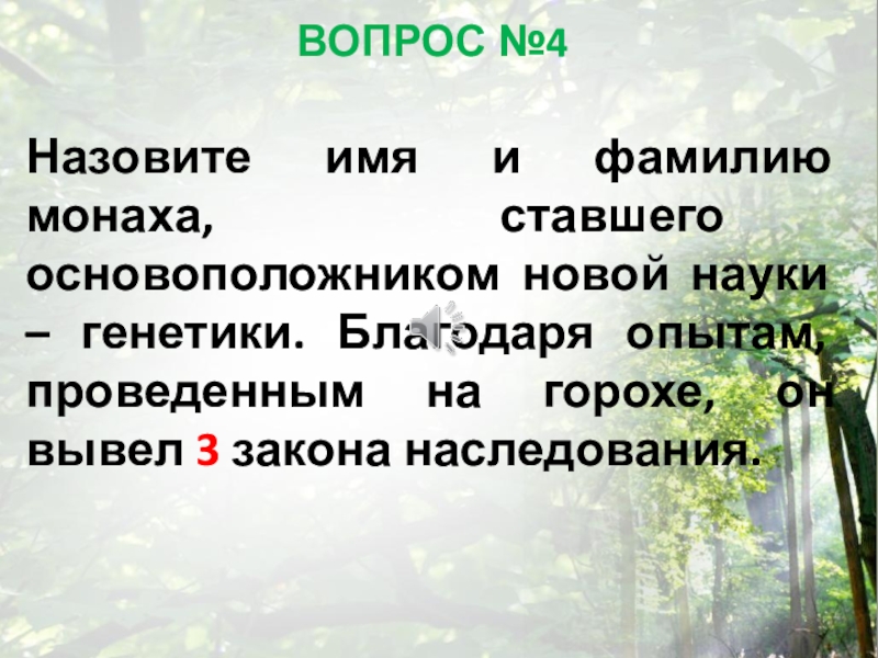 генетики. Благодаря опытам, проведенным на горохе, он вывел 3 закона наследования.