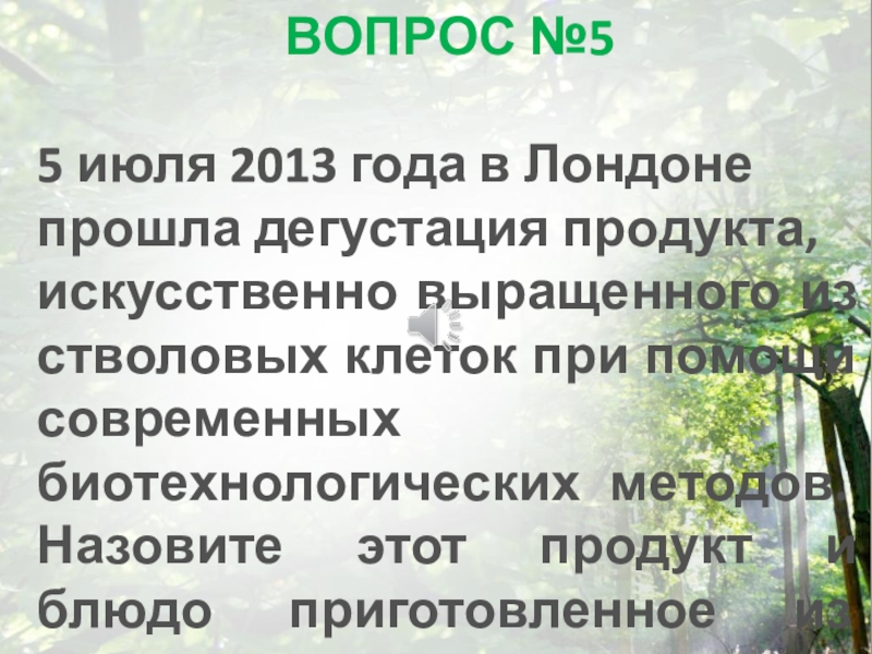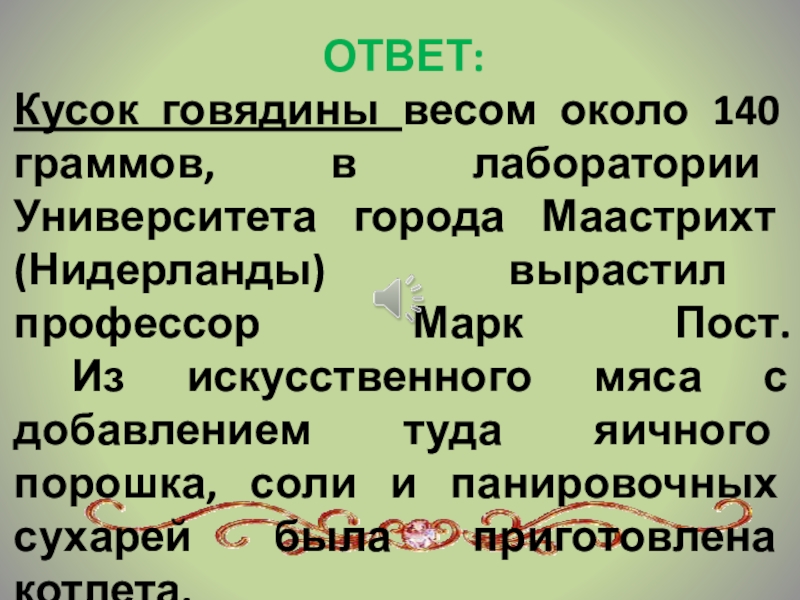 выращенного из стволовых клеток при помощи современных биотехнологических методов. Назовите этот продукт и блюдо приготовленное из него.
