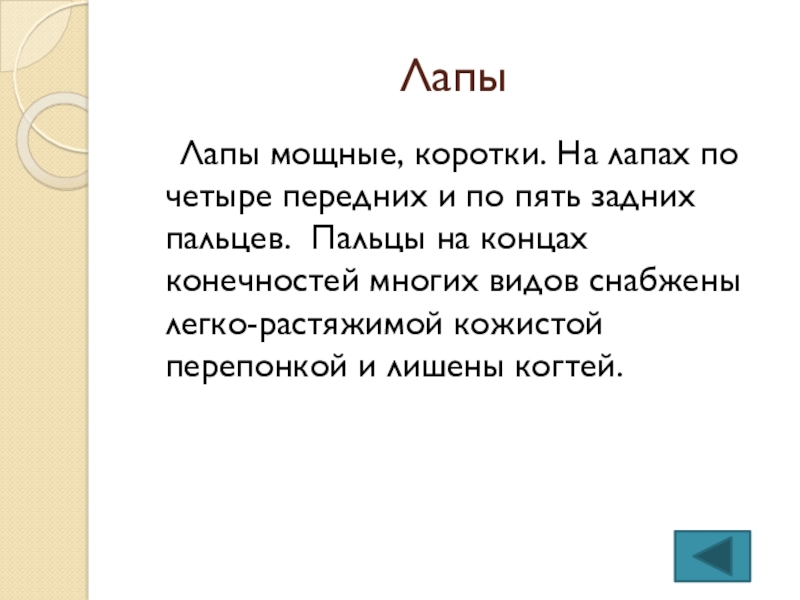 Лапы   Лапы мощные, коротки. На лапах по четыре передних и по пять задних пальцев.  Пальцы на