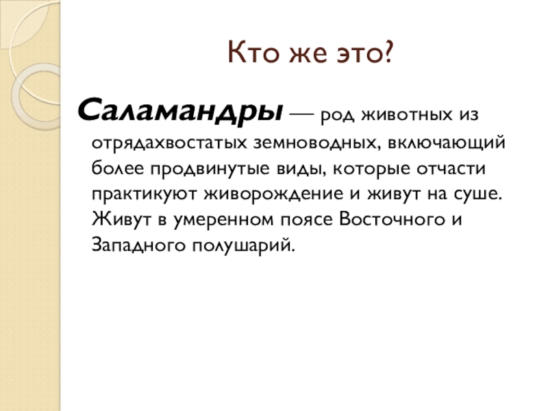 Кто же это?Саламандры — род животных из отрядахвостатых земноводных, включающий более продвинутые виды, которые отчасти практикуют живорождение и живут на суше. Живут в умеренном поясе Восточного и Западного полушарий.