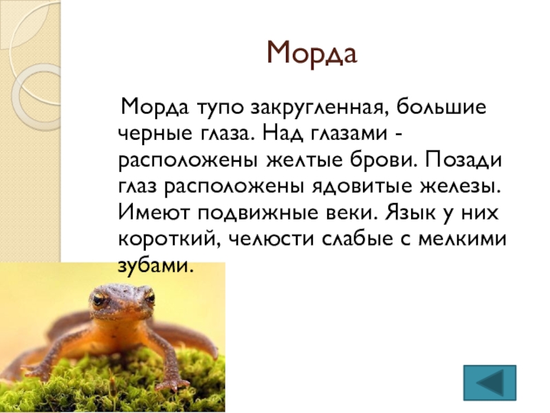 Морда  Морда тупо закругленная, большие черные глаза. Над глазами - расположены желтые брови. Позади глаз расположены ядовитые