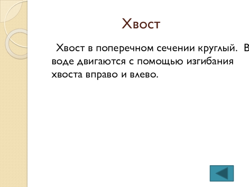 Хвост  Хвост в поперечном сечении круглый.  В воде двигаются с помощью изгибания хвоста вправо и влево.