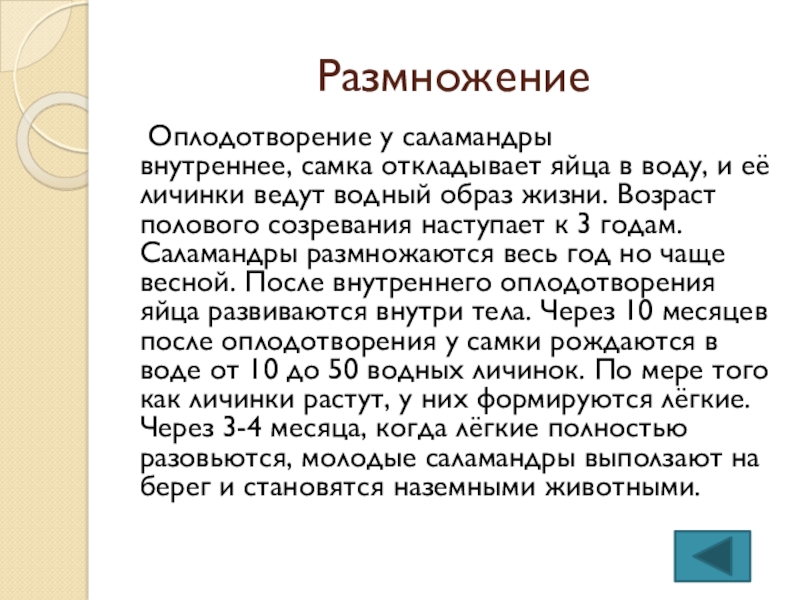 Размножение  Оплодотворение у саламандры внутреннее, самка откладывает яйца в воду, и её личинки ведут водный образ жизни.