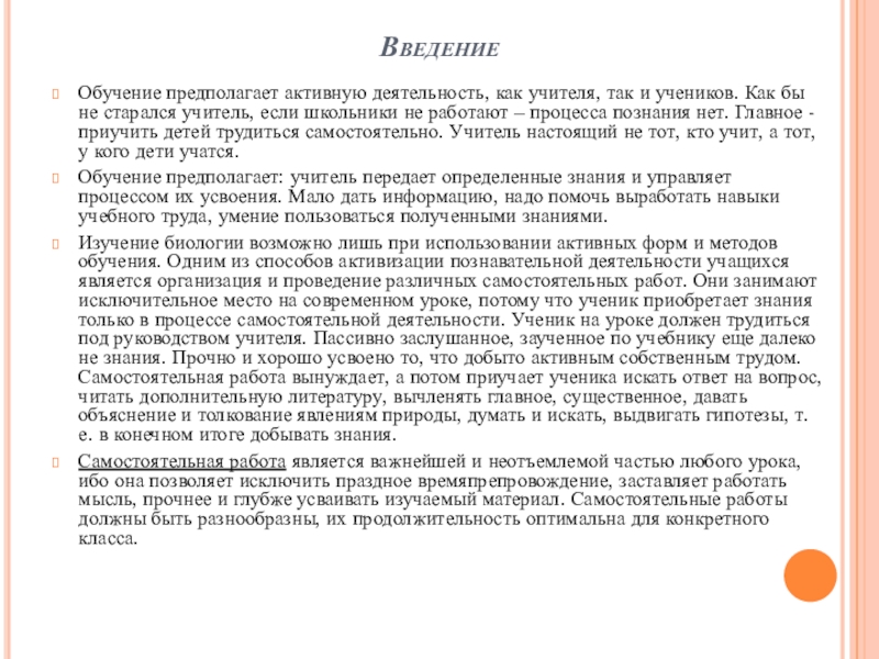 Изучение биологии возможно лишь при использовании активных форм и методов обучения. Одним из способов активизации познавательной деятельности учащихся является организация и проведение различных самостоятельных работ. Они занимают исключительное место на современном уроке, потому что ученик приобретает знания только в процессе самостоятельной деятельности. Ученик на уроке должен трудиться под руководством учителя. Пассивно заслушанное, заученное по учебнику еще далеко не знания. Прочно и хорошо усвоено то, что добыто активным собственным трудом. Самостоятельная работа вынуждает, а потом приучает ученика искать ответ на вопрос, читать дополнительную литературу, вычленять главное, существенное, давать объяснение и толкование явлениям природы, думать и искать, выдвигать гипотезы, т. е. в конечном итоге добывать знания.