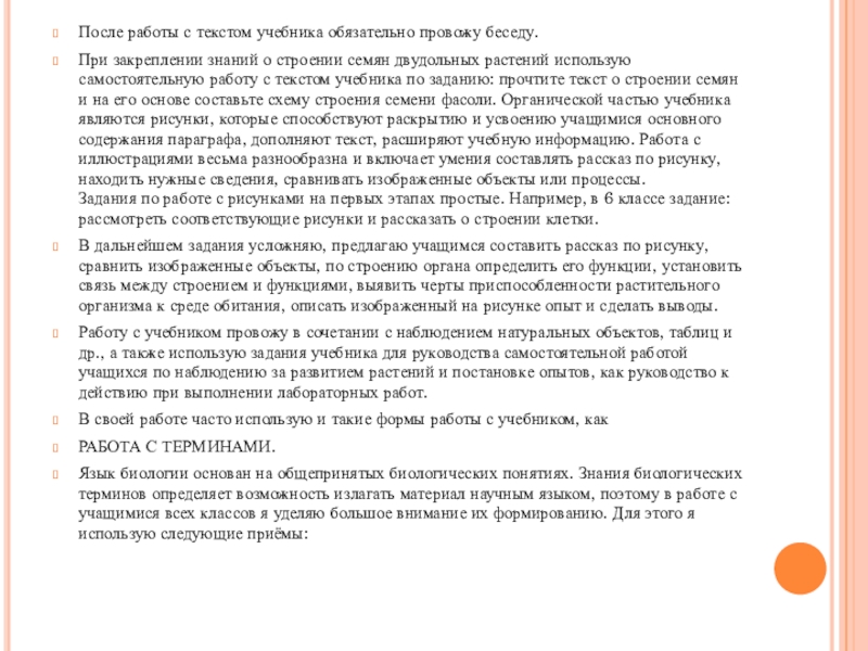 Работу с учебником провожу в сочетании с наблюдением натуральных объектов, таблиц и др., а также использую задания учебника для руководства самостоятельной работой учащихся по наблюдению за развитием растений и постановке опытов, как руководство к действию при выполнении лабораторных работ.
