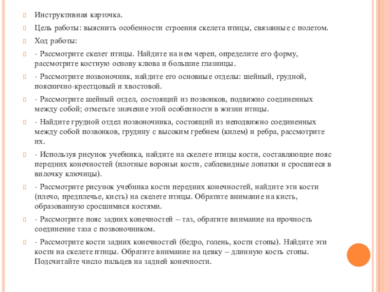 Цель работы: выяснить особенности строения скелета птицы, связанные с полетом.