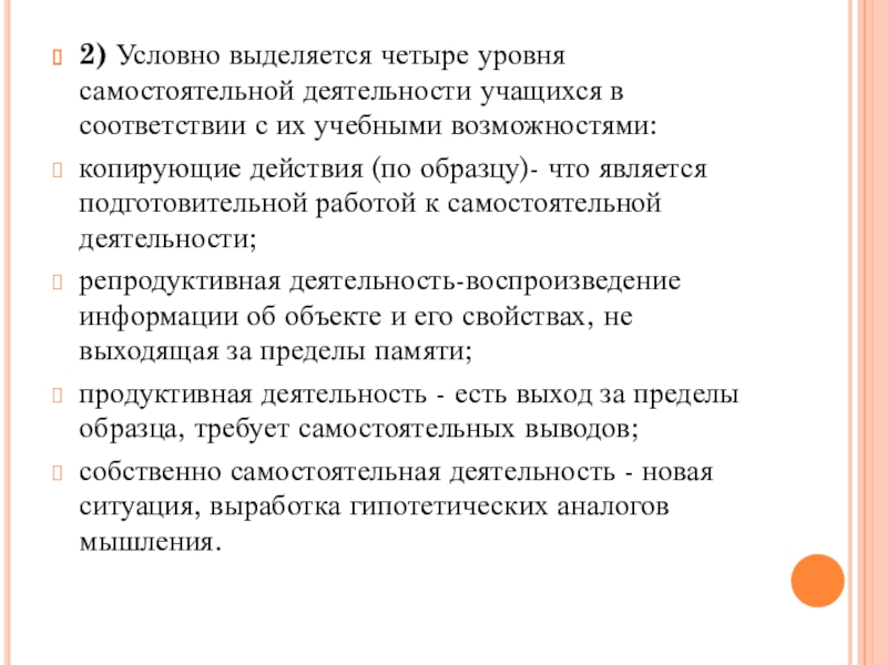Слайд 42) Условно выделяется четыре уровня самостоятельной деятельности учащихся в соответствии с