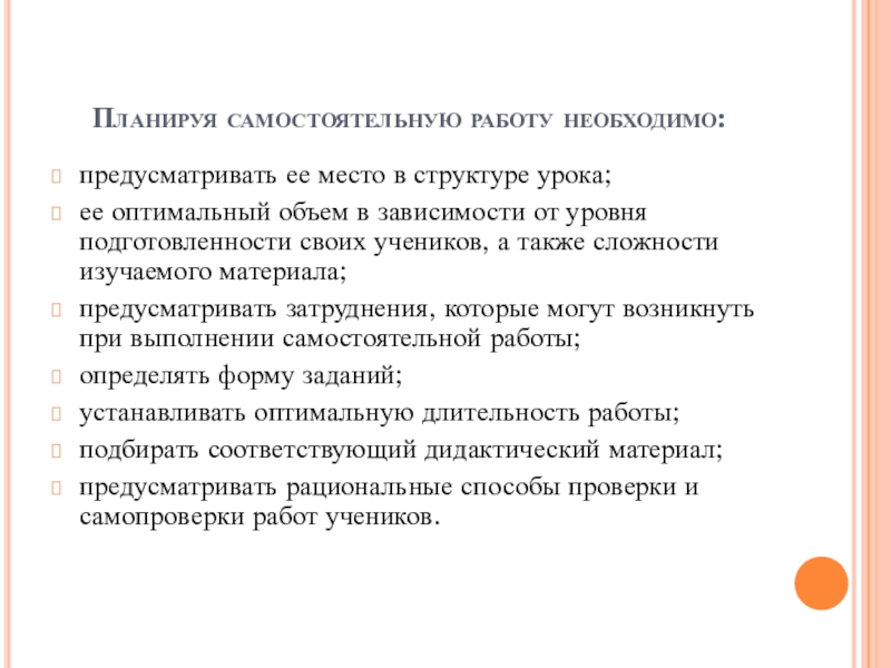 предусматривать затруднения, которые могут возникнуть при выполнении самостоятельной работы;