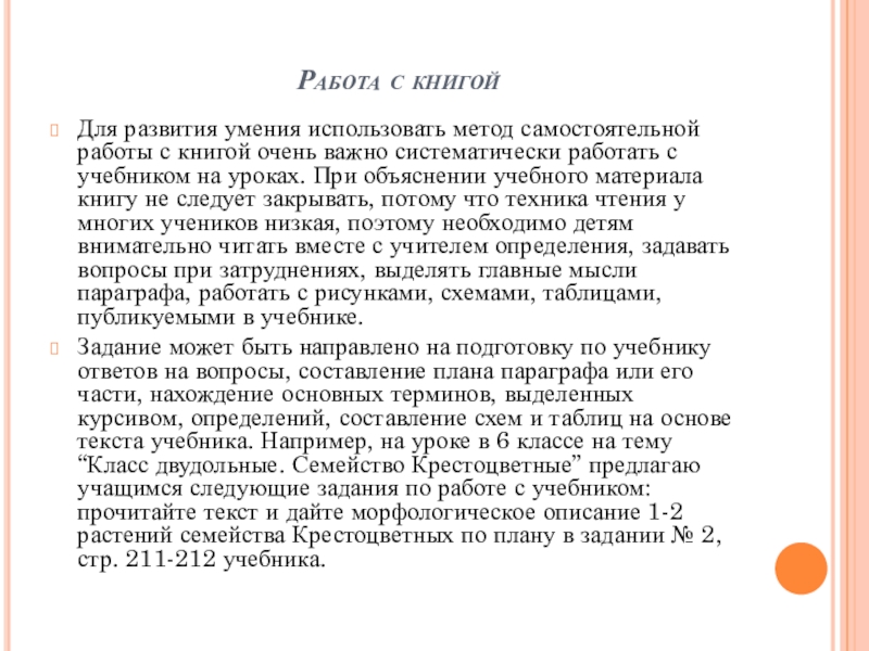 Задание может быть направлено на подготовку по учебнику ответов на вопросы, составление плана параграфа или его части, нахождение основных терминов, выделенных курсивом, определений, составление схем и таблиц на основе текста учебника. Например, на уроке в 6 классе на тему “Класс двудольные. Семейство Крестоцветные” предлагаю учащимся следующие задания по работе с учебником: прочитайте текст и дайте морфологическое описание 1-2 растений семейства Крестоцветных по плану в задании № 2, стр. 211-212 учебника.