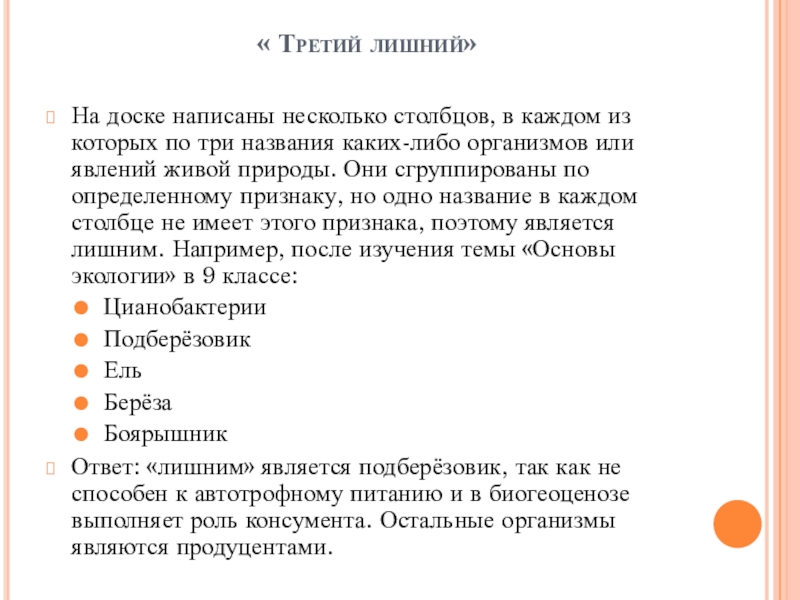 по три названия каких-либо организмов или явлений живой природы. Они сгруппированы по определенному признаку, но одно название в каждом столбце не имеет этого признака, поэтому является лишним. Например, после изучения темы «Основы экологии» в 9 классе: