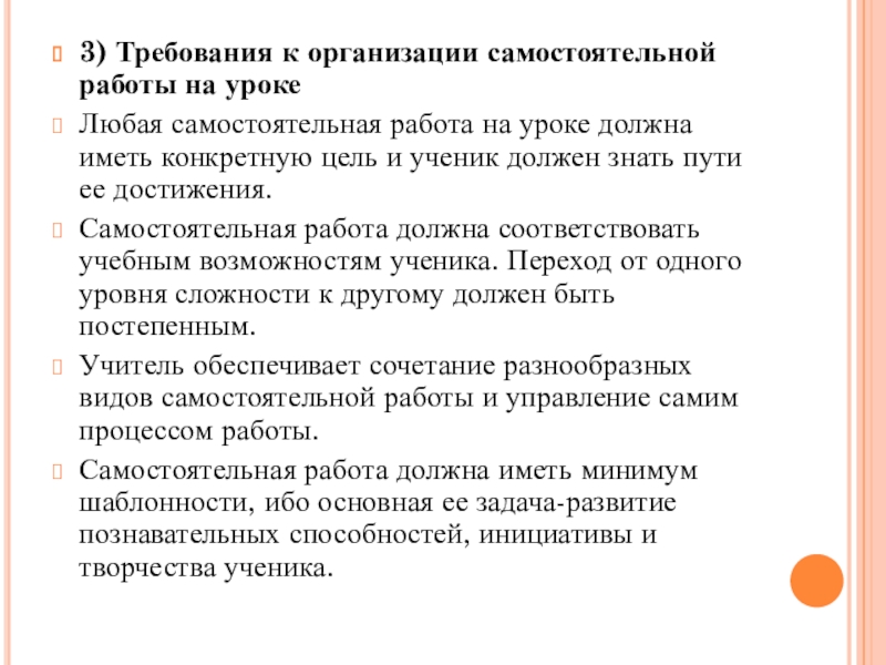 Слайд 53) Требования к организации самостоятельной работы на уроке