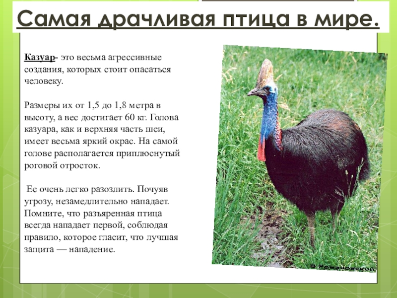 Ее очень легко разозлить. Почуяв угрозу, незамедлительно нападает. Помните, что разъяренная птица всегда нападает первой, соблюдая правило, которое гласит, что лучшая защита — нападение.