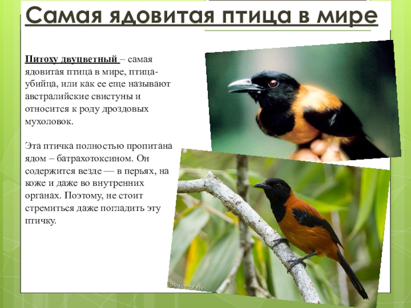 Эта птичка полностью пропитана ядом – батрахотоксином. Он содержится везде — в перьях, на коже и даже во внутренних органах. Поэтому, не стоит стремиться даже погладить эту птичку.