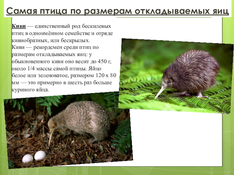 Киви — рекордсмен среди птиц по размерам откладываемых яиц: у обыкновенного киви оно весит до 450 г, около 1/4 массы самой птицы. Яйцо белое или зеленоватое, размером 120 x 80 мм — это примерно в шесть раз больше куриного яйца.