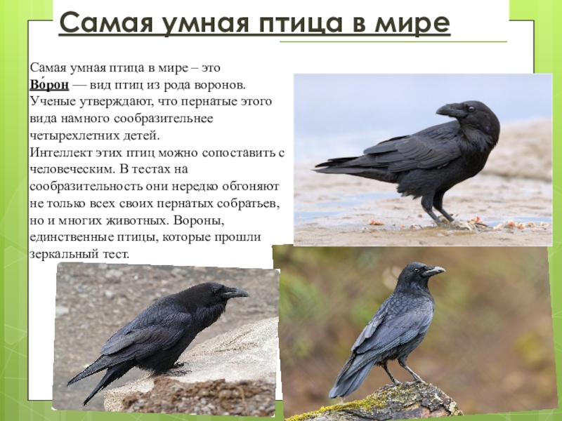 Интеллект этих птиц можно сопоставить с человеческим. В тестах на сообразительность они нередко обгоняют не только всех своих пернатых собратьев, но и многих животных. Вороны, единственные птицы, которые прошли зеркальный тест.