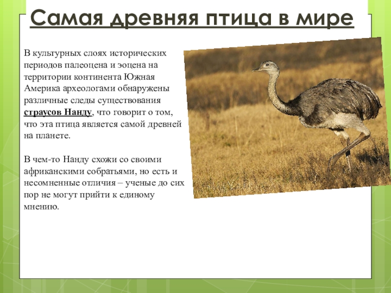 эоцена на территории континента Южная Америка археологами обнаружены различные следы существования страусов Нанду, что говорит о том, что эта птица является самой древней на планете.