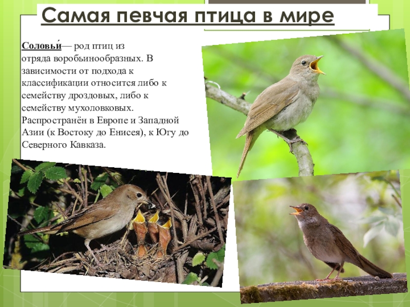 Соловьи́— род птиц из отряда воробьинообразных. В зависимости