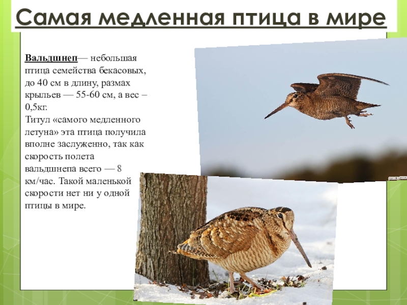 Титул «самого медленного летуна» эта птица получила вполне заслуженно, так как скорость полета вальдшнепа всего — 8 км/час. Такой маленькой скорости нет ни у одной птицы в мире.