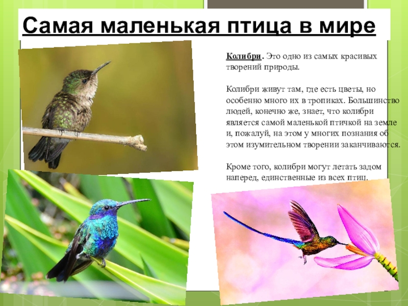 Кроме того, колибри могут летать задом наперед, единственные из всех птиц.