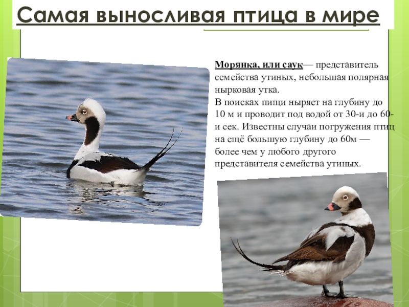 Морянка, или саук— представитель семейства утиных, небольшая полярная нырковая