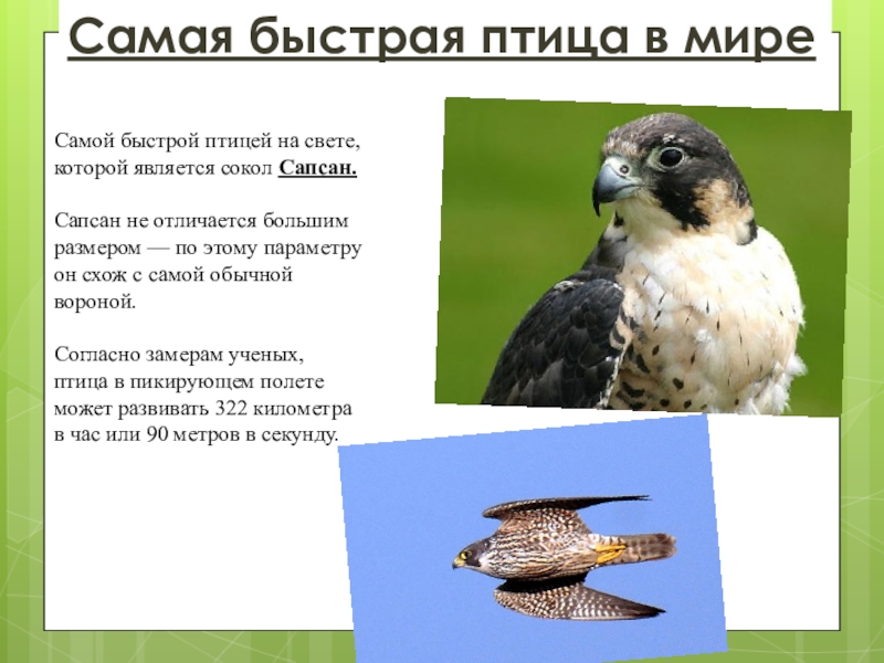 Согласно замерам ученых, птица в пикирующем полете может развивать 322 километра в час или 90 метров в секунду.