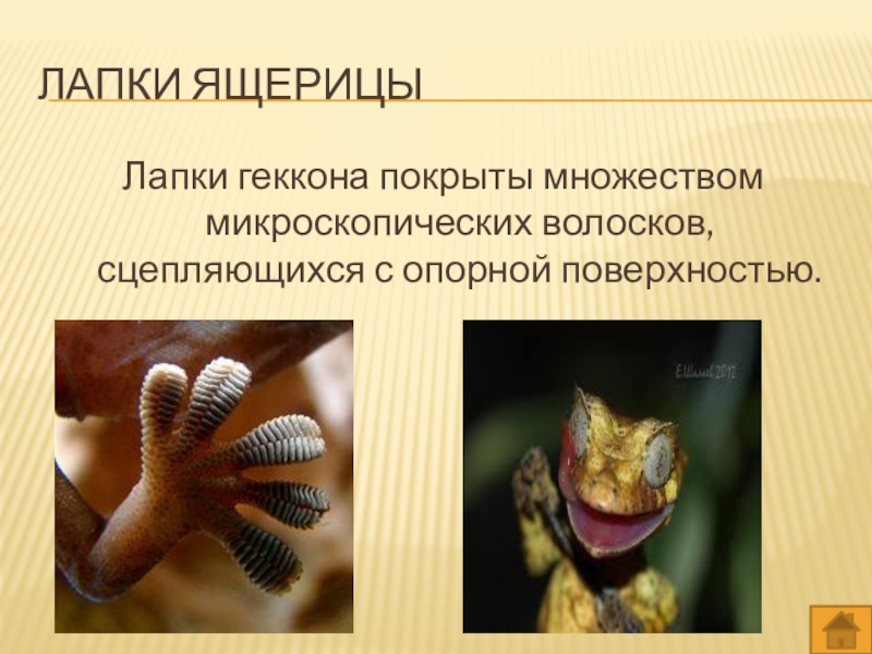 Лапки ящерицыЛапки геккона покрыты множеством микроскопических волосков, сцепляющихся с опорной поверхностью.