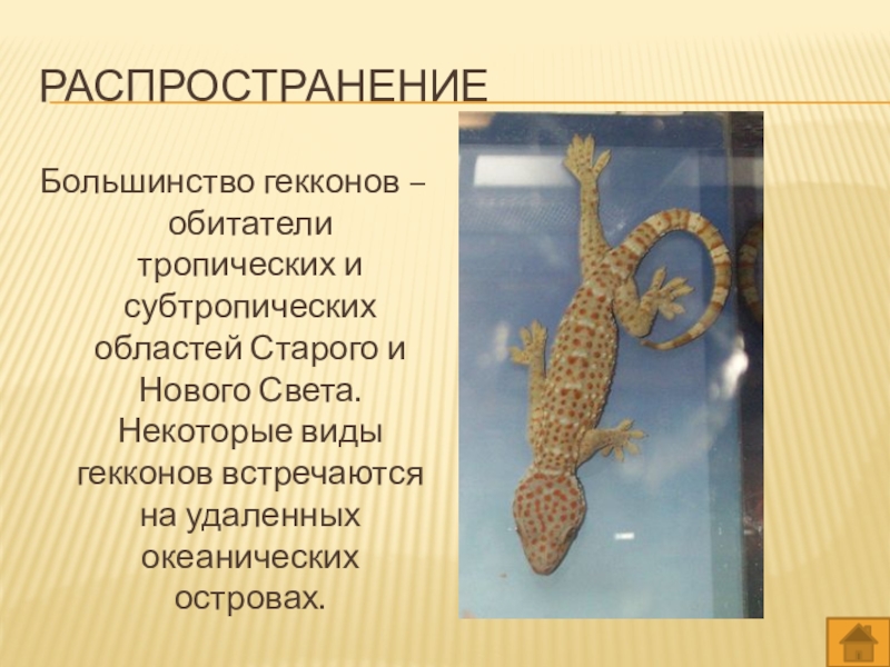 РаспространениеБольшинство гекконов – обитатели тропических и субтропических областей Старого и Нового Света. Некоторые виды гекконов встречаются на