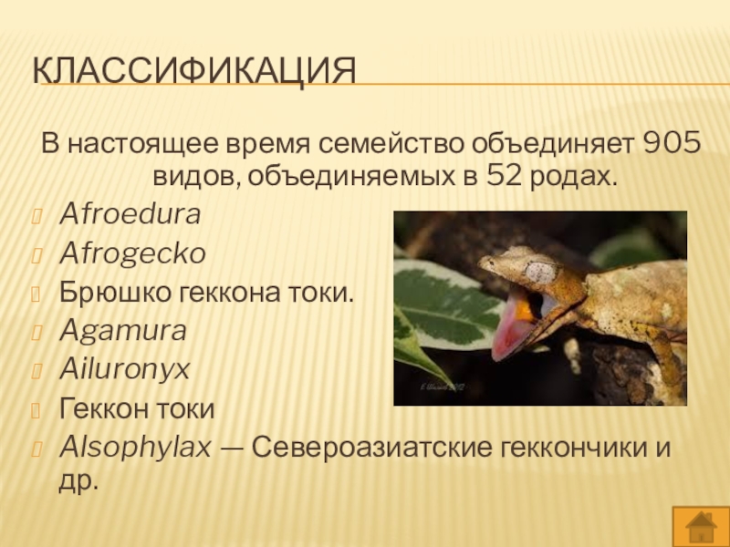 КлассификацияВ настоящее время семейство объединяет 905 видов, объединяемых в 52 родах.AfroeduraAfrogeckoБрюшко геккона токи.AgamuraAiluronyxГеккон токиAlsophylax — Североазиатские геккончики и