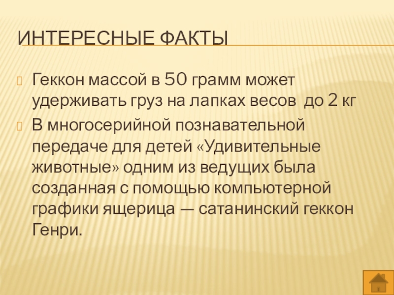 Интересные фактыГеккон массой в 50 грамм может удерживать груз на лапках весов до 2 кгВ многосерийной познавательной