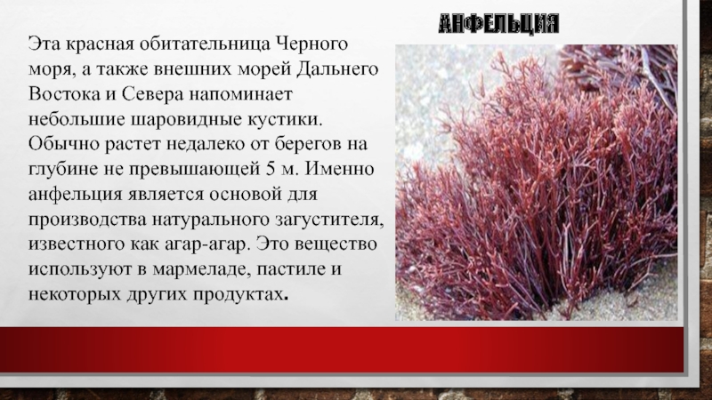 и Севера напоминает небольшие шаровидные кустики. Обычно растет недалеко от берегов на глубине не превышающей 5 м. Именно анфельция является основой для производства натурального загустителя, известного как агар-агар. Это вещество используют в мармеладе, пастиле и некоторых других продуктах.