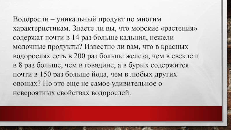 Слайд 3Водоросли – уникальный продукт по многим характеристикам. Знаете ли вы, что