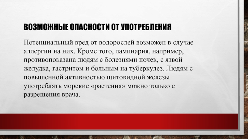 на них. Кроме того, ламинария, например, противопоказана людям с болезнями почек, с язвой желудка, гастритом и больным на туберкулез. Людям с повышенной активностью щитовидной железы употреблять морские «растения» можно только с разрешения врача.