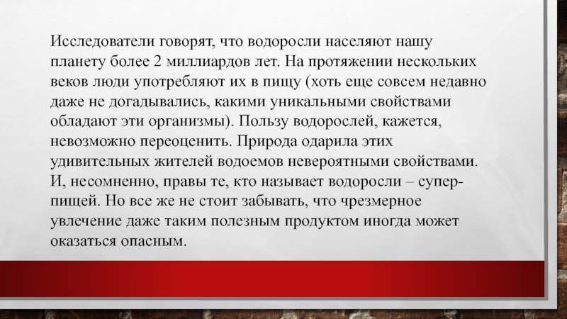 Слайд 13Исследователи говорят, что водоросли населяют нашу планету более 2 миллиардов лет.