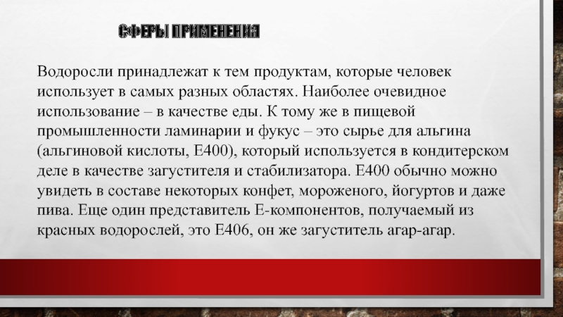 разных областях. Наиболее очевидное использование – в качестве еды. К тому же в пищевой промышленности ламинарии и фукус – это сырье для альгина (альгиновой кислоты, Е400), который используется в кондитерском деле в качестве загустителя и стабилизатора. Е400 обычно можно увидеть в составе некоторых конфет, мороженого, йогуртов и даже пива. Еще один представитель Е-компонентов, получаемый из красных водорослей, это Е406, он же загуститель агар-агар.