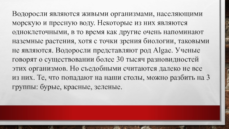 Слайд 2Водоросли являются живыми организмами, населяющими морскую и пресную воду. Некоторые из