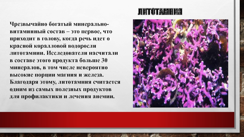 когда речь идет о красной коралловой водоросли литотамнии. Исследователи насчитали в составе этого продукта больше 30 минералов, в том числе невероятно высокие порции магния и железа. Благодаря этому, литотамния считается одним из самых полезных продуктов для профилактики и лечения анемии.