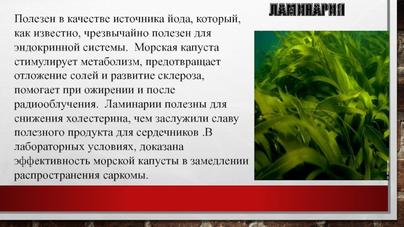 эндокринной системы. Морская капуста стимулирует метаболизм, предотвращает отложение солей и развитие склероза, помогает при ожирении и после радиооблучения. Ламинарии полезны для снижения холестерина, чем заслужили славу полезного продукта для сердечников .В лабораторных условиях, доказана эффективность морской капусты в замедлении распространения саркомы.