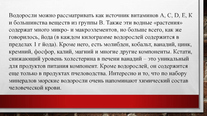 и большинства веществ из группы В. Также эти водные «растения» содержат много микро- и макроэлементов, но больше всего, как же говорилось, йода (в каждом килограмме водорослей содержится в пределах 1 г йода). Кроме него, есть молибден, кобальт, ванадий, цинк, кремний, фосфор, калий, магний и многие другие компоненты. Кстати, снижающий уровень холестерина в печени ванадий – это уникальный для продуктов питания компонент. Кроме водорослей, он содержится еще только в продуктах пчеловодства. Интересно и то, что по набору минералов морские водоросли очень напоминают химический состав человеческой крови.