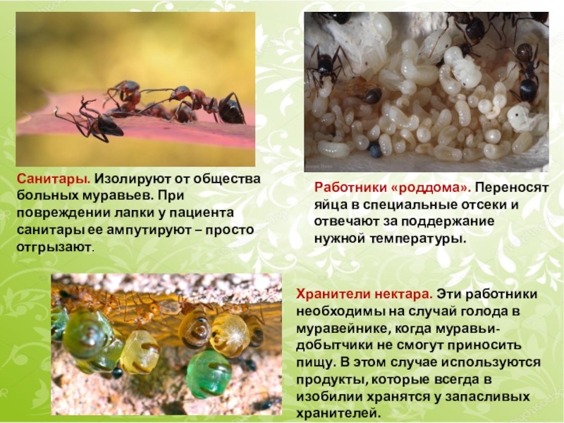 Хранители нектара. Эти работники необходимы на случай голода в муравейнике, когда муравьи-добытчики не смогут приносить пищу. В этом случае используются продукты, которые всегда в изобилии хранятся у запасливых хранителей.