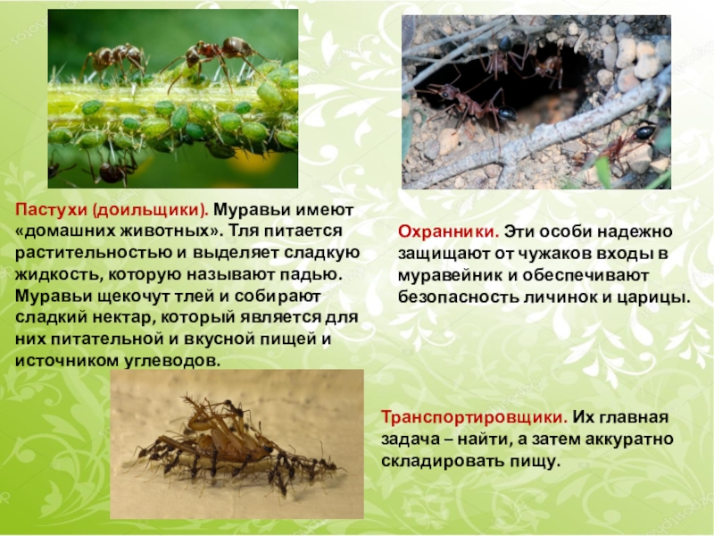 Пастухи (доильщики). Муравьи имеют «домашних животных». Тля питается растительностью и выделяет сладкую жидкость, которую называют падью. Муравьи щекочут тлей и собирают сладкий нектар, который является для них питательной и вкусной пищей и источником углеводов.