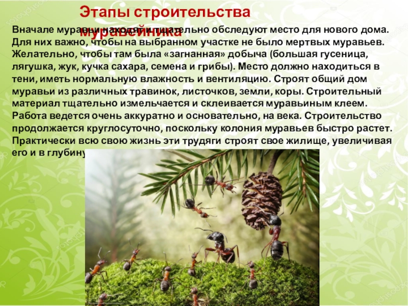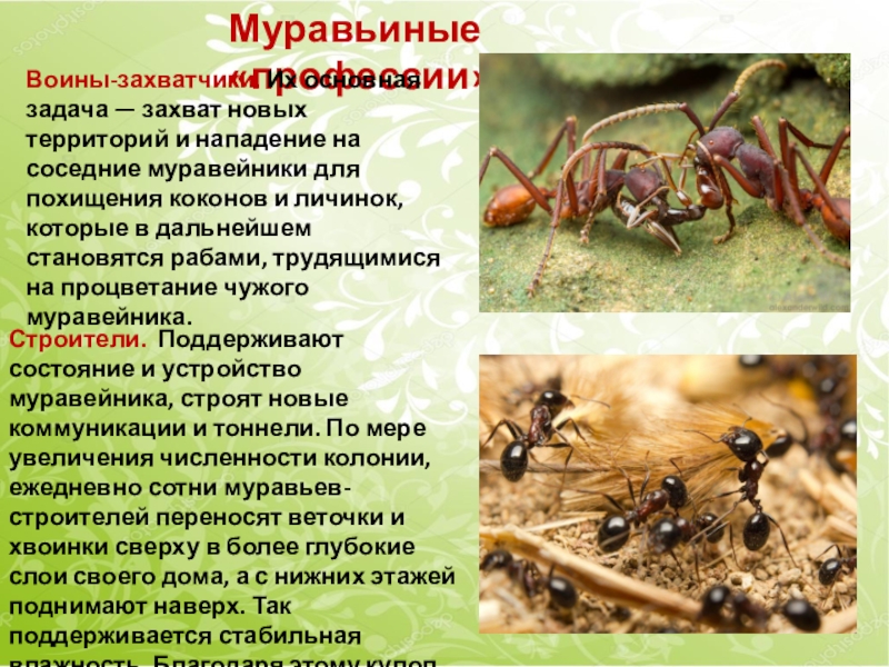 Строители. Поддерживают состояние и устройство муравейника, строят новые коммуникации и тоннели. По мере увеличения численности колонии, ежедневно сотни муравьев-строителей переносят веточки и хвоинки сверху в более глубокие слои своего дома, а с нижних этажей поднимают наверх. Так поддерживается стабильная влажность. Благодаря этому купол муравейника не плесневеет и не загнивает.
