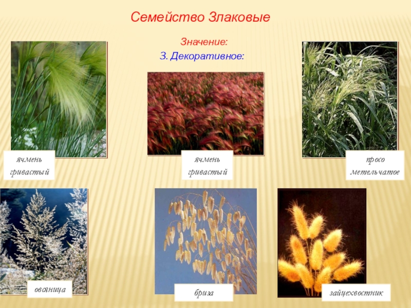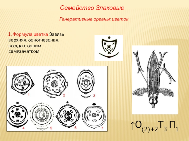 У большинства злаков цветок имеет 2 цветковые чешуи и 2 цветковые пленки. Тычинок в цветке обычно 3. Пестик один с двумя сидячими мохнатыми рыльцами.