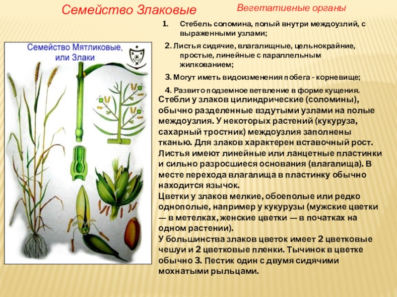 Цветки у злаков мелкие, обоеполые или редко однополые, например у кукурузы (мужские цветки — в метелках, женские цветки — в початках на одном растении).