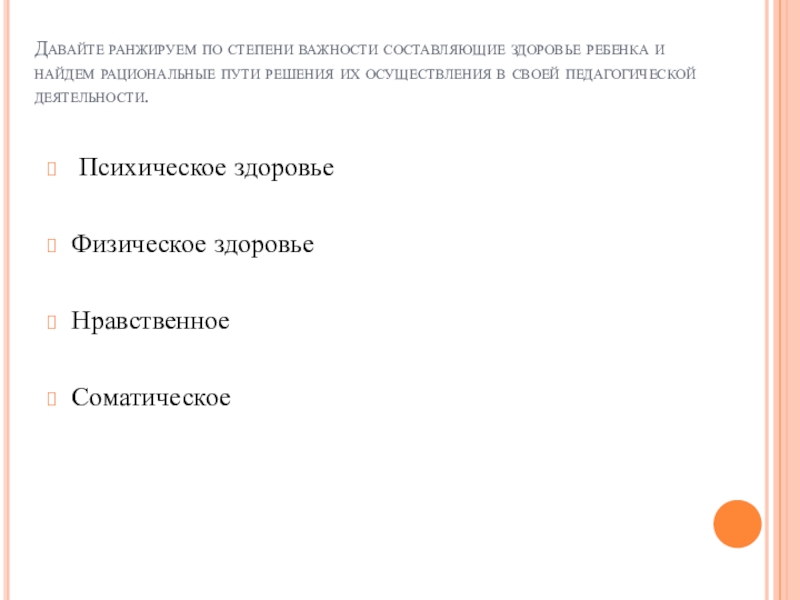 Слайд 7Давайте ранжируем по степени важности составляющие здоровье ребенка и найдем рациональные
