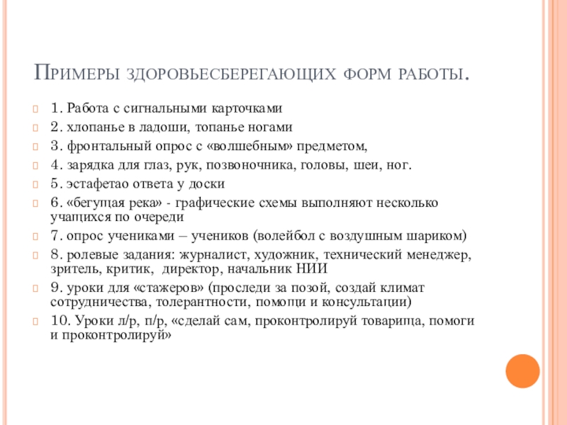 Слайд 11Примеры здоровьесберегающих форм работы.