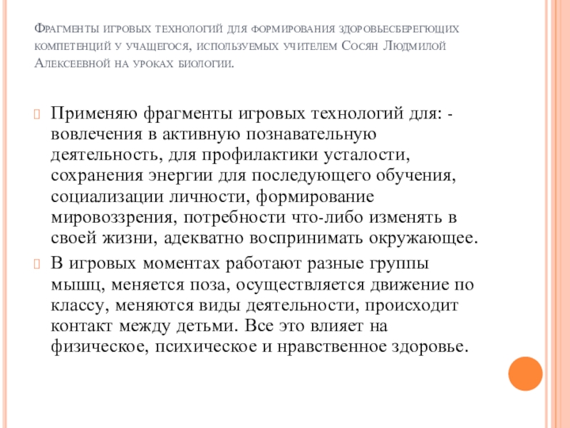 Фрагменты игровых технологий для формирования здоровьесберегющих компетенций у учащегося, используемых учителем