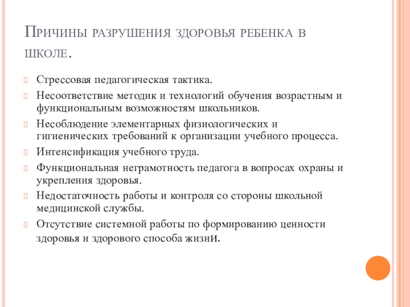 Слайд 2Причины разрушения здоровья ребенка в школе.
