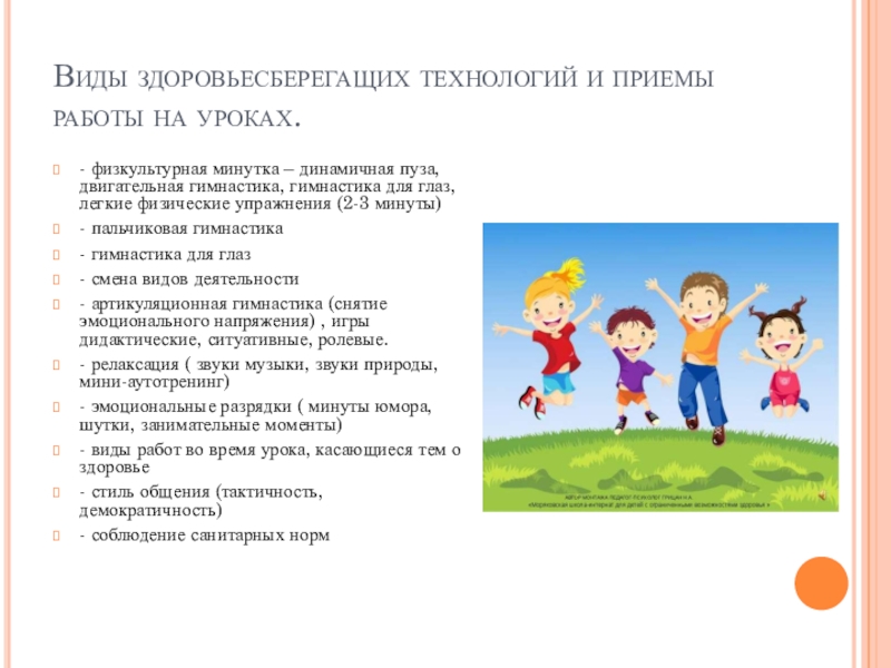 Слайд 9Виды здоровьесберегащих технологий и приемы работы на уроках.