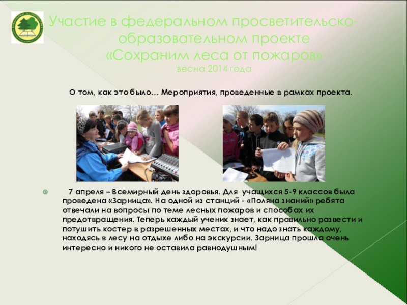 7 апреля – Всемирный день здоровья. Для учащихся 5-9 классов была проведена «Зарница». На одной из станций - «Поляна знаний» ребята отвечали на вопросы по теме лесных пожаров и способах их предотвращения. Теперь каждый ученик знает, как правильно развести и потушить костер в разрешенных местах, и что надо знать каждому, находясь в лесу на отдыхе либо на экскурсии. Зарница прошла очень интересно и никого не оставила равнодушным!