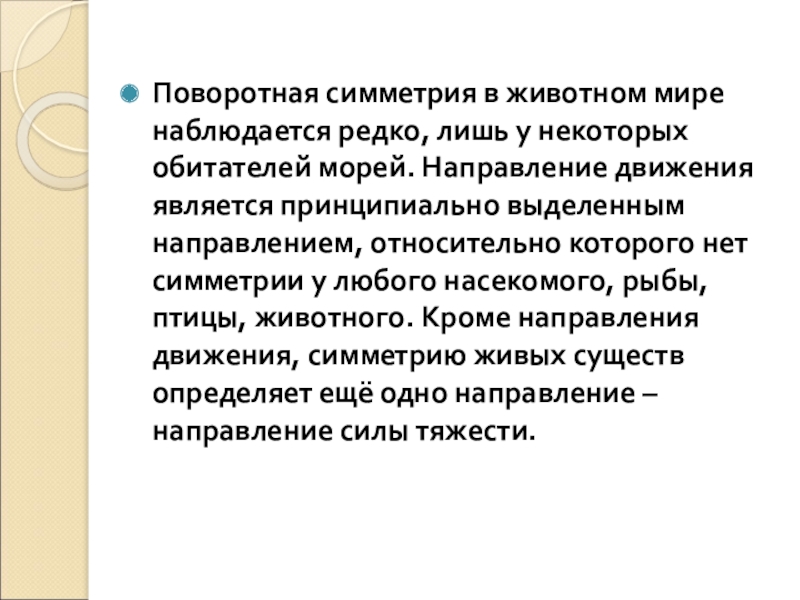 морей. Направление движения является принципиально выделенным направлением, относительно которого нет симметрии у любого насекомого, рыбы, птицы, животного. Кроме направления движения, симметрию живых существ определяет ещё одно направление – направление силы тяжести.
